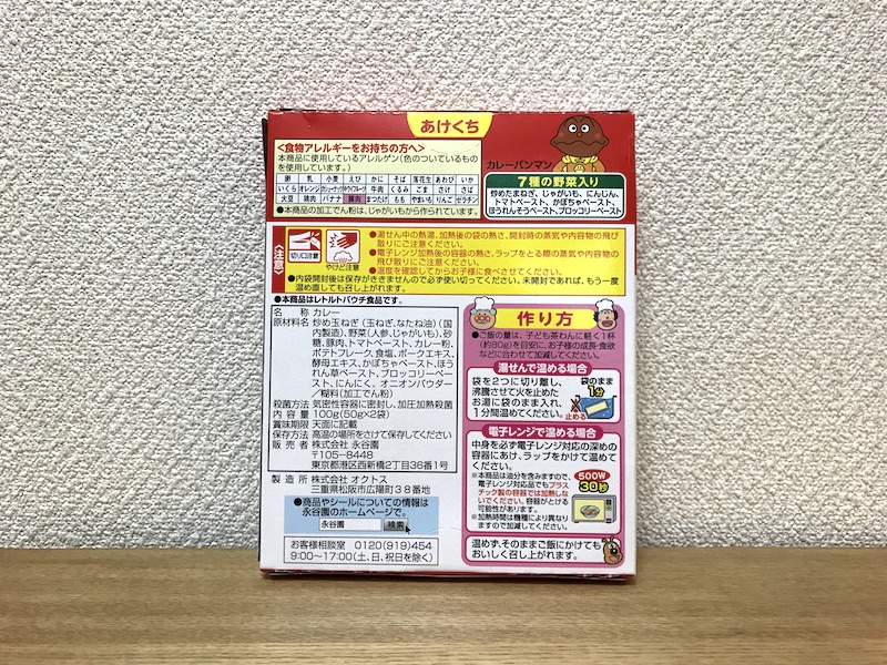 子供のご飯に困ったときは、とりあえずアンパンマンカレーを食べさせてました。パッケージに「7 種類の野菜入り」と書いてあって、レトルトだけどちょっとだけ罪悪感が薄れるんです。