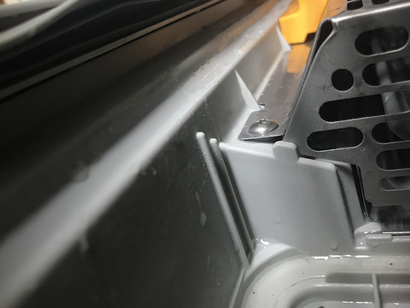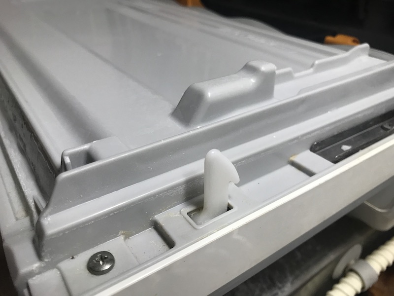 「食洗機のドア開エラー」で検索すると、自分で修理した人の記事がいくつも見つかります。分解が大変そうで自分には無理ですが、ドアの左右両側についているこのツメがセンサーに当たることで、ドアが閉まっているかどうかを見ているようです。